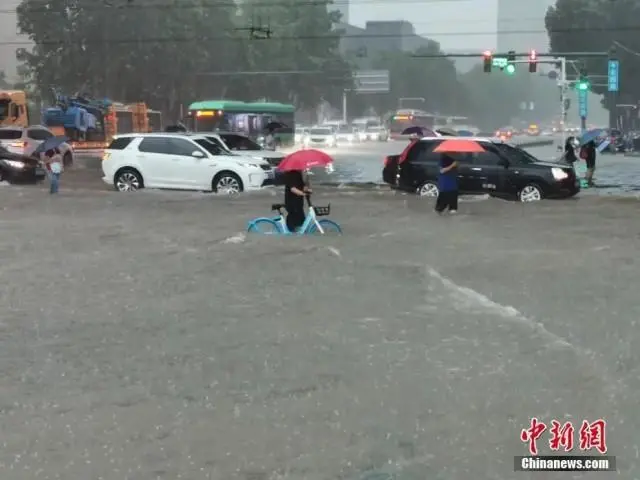 7月20日,河南鄭州,車輛經(jīng)過積水路段。近日,鄭州連遭暴雨襲擊,持續(xù)強降雨導致部分街道積水嚴重。